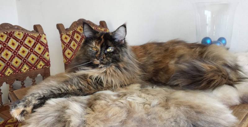 Chumani is het eerst geboren kitten van Nýpa, de kleinste uit het nest. Dat is ondertussen al aardig bijgetrokken, want inmiddels weegt ze al meer dan 5 kg. Zij is, net zoals haar moeder, wat éénkennig in het begin, maar daarna gaat ze los! Gek op aandacht en spelen, momenteel is ze een beetje het enfant terrible in huis. Knotsgek af en toe, met racepartijen door het huis weet ze dan wel weer de aandacht te krijgen. Ze ligt graag half op schoot in de typische Coon houding: één poot naar voren. Ze heeft de look van haar vader meegekregen, net zoals haar volle vacht. Chumani zal haar moeder Nýpa gaan opvolgen in de fokkerij.